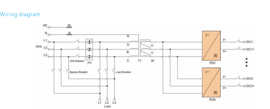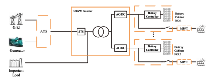 Феатуре Систем користи модуларне инвертерске јединице у паралелној конфигурацији, где ДЦ улаз сваког инверторског модула одговара наменском ормарићу за батерије, омогућавајући управљање по кластерима да елиминише циркулишуће струје између жице за батерије. АЦ/ДЦ модули за напајање подржавају флексибилну примену како у количини тако иу називна снага, са максималним капацитетом модула од 60кВ у паралели од 5 јединица конфигурацију. Излаз наизменичне струје из енергетских модула се испоручује преко трансформатора изоловани излазни степен, напајајући оптерећење са јаким отпором на тренутни шок. Хибридни ЕСС користи фотонапонску интеграцију спојену једносмерном струјом, постижући високе ефикасност конверзије енергије и оптимизован за сценарије ван мреже са ПВ производни капацитет који премашује потражњу за оптерећењем; МППТ контролери за спољашњу употребу интегрише комбинатор и МППТ функционалности у једно ојачано кућиште. Комплетан систем укључује дизел генератор АТС опцију, 300кВ хибрид инвертер, ПВ МППТ контролер и систем за складиштење енергије батерије.